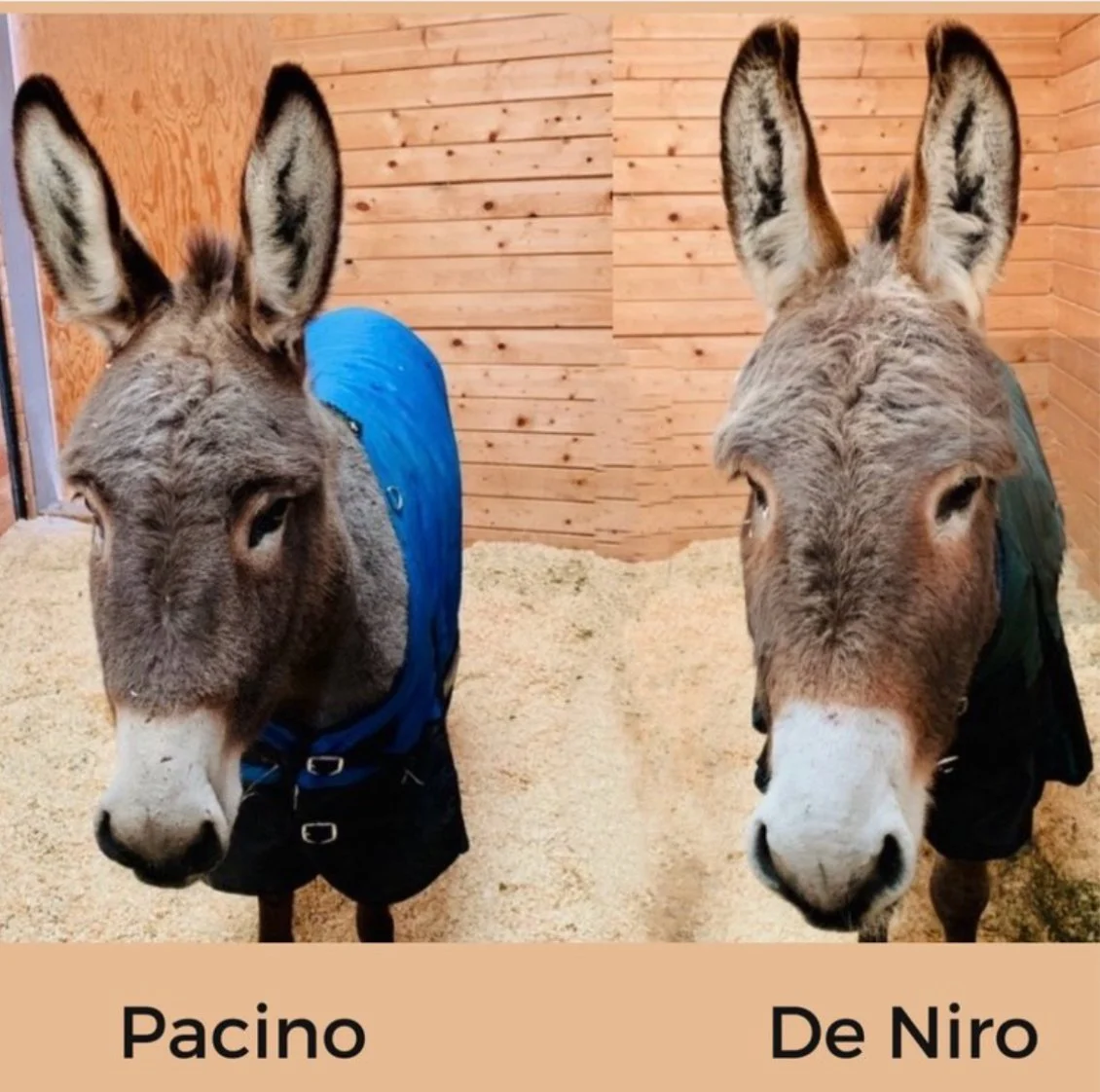 In 2019, as we were looking at pictures of Redford and Eastwood in a filthy Texas kill pen, we noticed little hooves and long ears were in there with them. One was listed, the other was not as he had been paid for, but never picked up. Hauling donkeys in the dead of winter is always a risk, but leaving them behind means certain death. Donkeys and burros suffer greatly on the lots. Respiratory diseases take them down quickly, or they get packed onto trucks to meet a savagely terrible death in the ejiao trade. We could not let this happen to these little guys. As soon as our wonderful hauler, Marlene Dodge, said yes to fitting them on board, Robert De Niro, Al Pacino, and a third little donkey, Joe Pesci, jumped on the freedom ride outta there.
