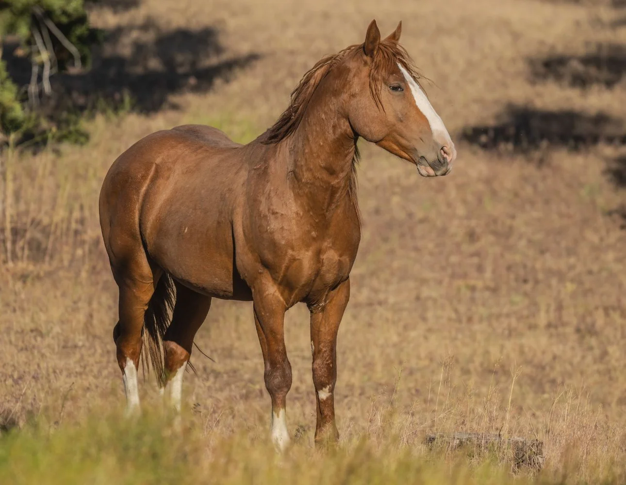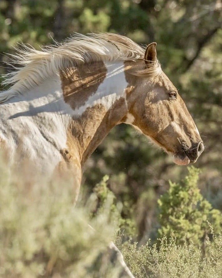 A god of the sun, king of Red Desert, and legend of the fall, Apollo was 22 years old when we saw him in the Cañon City auction. The oldest, he was incredibly bonded and dependent upon his son, Aslan. When they went to move and load him, he tried to go over the top several times and ran into panels, bending them with his sheer force and power. It was incredibly stressful, but putting him with together with Aslan was the best thing we could have done to calm him for safe travel to Oregon. At Skydog, we brought Apollo together with his former mare on the range, Hera, but the father-son relationship was what mattered most to him. Since then, another son, Hermés, has joined him. He keeps his distance from humans and is happy in the wild freedom that is his once again - and forever. More about Apollo