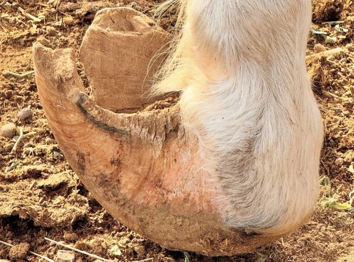 In 2024, Janelle went to a ranch in Nevada to pick up Libby. While she was there, she noticed horses in serious need of hoof care. We knew we had to do something to help, including take a portable hydraulic chute so Janelle could do some farrier work. Two mustangs had club feet as bad as Waldo’s: Starbucks and Courage.