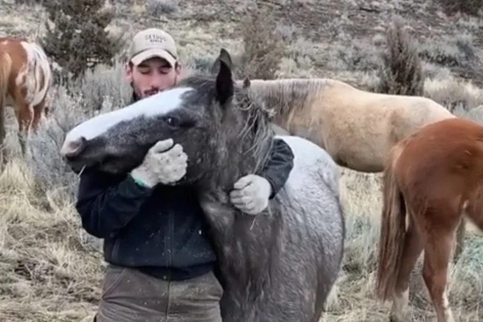 We found this photograph of a mare, who had just given birth to a sickly blue roan baby at BLM Burns corrals in Oregon. Taylor was only one year old, a baby herself, when she was rounded up pregnant from the South Steens HMA. Her baby was sickly and weak, so we couldn’t wait to get the two of them out of there and bring them back into health. We named the mother Taylor, and her baby Swift, as the music of their namesake has been such a big part of our lives at the ranches, singing along as we work. Tickets to see her in concert (two fifth row seats!) were a star prize in one of our online fundraising auctions.